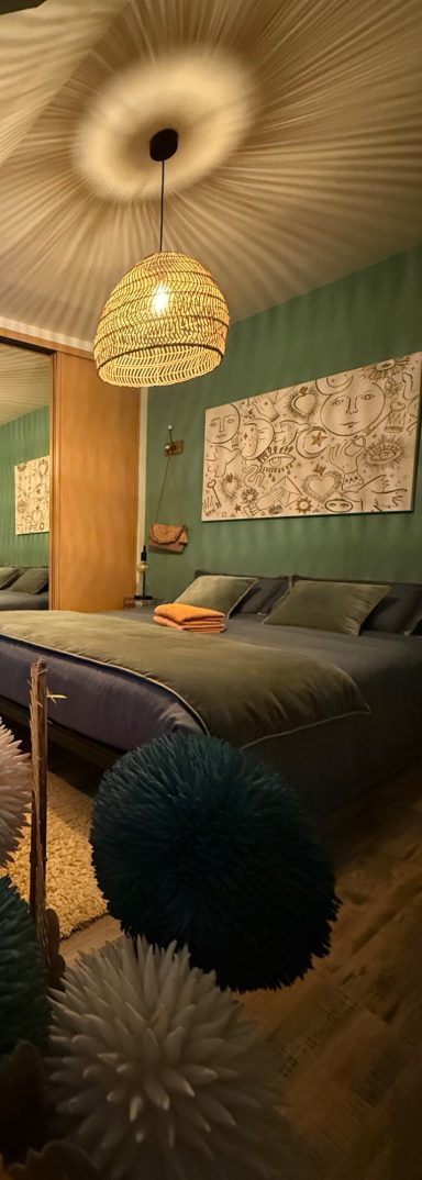 Cette chambre est une belle escapade. Que ce soit pour une nuit paisible ou une parenthèse inspirante, chaque élément a été pensé pour créer une expérience unique et immersive. Bienvenue dans cet espace où la couleur, le confort et l'évasion se marient harmonieusement pour créer des souvenirs inoubliables.